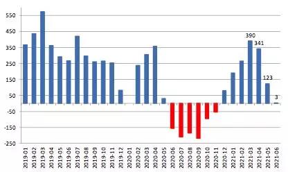 2021上半年我国钢材出口量同比增长30.2%,较2020全年出口量相差1629.5万吨。继5月出口量显著回落后,6月再度回升至645.8万吨。具体情况如下: