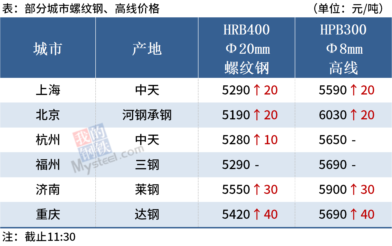 ◎上海:5日早盘建材市场价格整体上涨20-40。现螺纹5210-5260,西城抗震5250,其他5070-5100,兴鑫抗震5110,联鑫黄海抗震5120,盘螺5400-5590,高线亚新5380。4日Mysteel上海螺纹钢价格指数5303涨8。(单位:元/吨)
