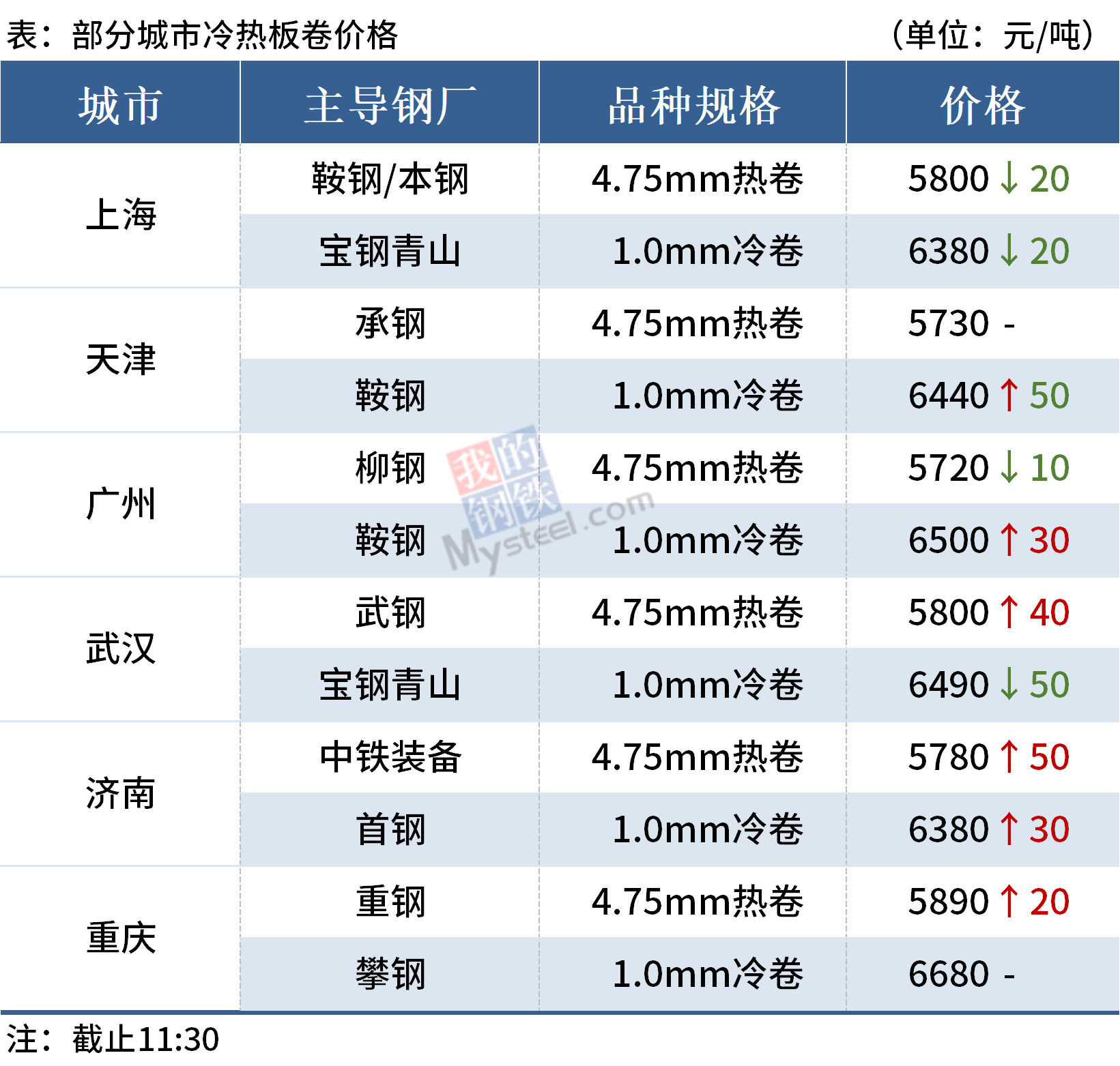 ◎武汉:5日早盘冷轧市场价格上涨50,1.0宝钢青山卷6490,1.5卷6440,3.0卷6850。(单位:元/吨)